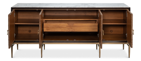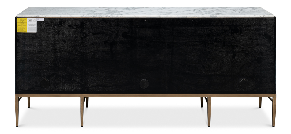Introducing the Palisades Credenza, a contemporary masterpiece blending Wood, Metal, Leather, and adorned with Italian Satuario Marble, this elegant piece stands at 80"w x 19"d x 34"h. Its harmonious fusion of materials creates a sophisticated narrative, offering both style and functionality. Elevate your space with this modern Credenza, where contemporary design meets timeless elegance in a symphony of textures and forms.